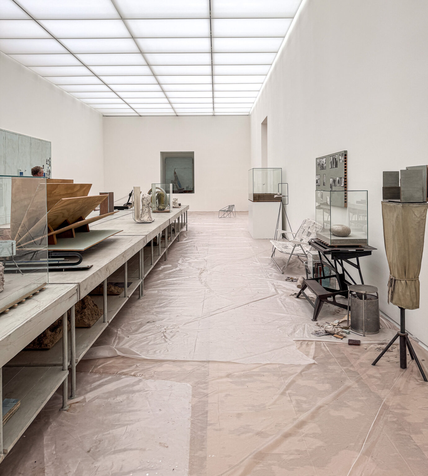 Overal in de tentoonstelling is er het gevoel van een tijdelijke en veranderlijke situatie. De plastic folie op de grond en de folie als wand suggereren momenten in een beweeglijk proces. De folie wordt ook gebruikt als afscherming van kleibeelden, alsof ze niet mogen uitdrogen tijdens het maakproces. Er zijn schragen en provisorische tafels zichtbaar. Metalen voeten en palen houden de wanden van folie overeind. Zwartmetalen klemmen houden houten planken vast die er uit zien als een tijdelijke opslag, bijna klaar voor vervoer. In Unfired Clay Head staat een ‘plakje gezicht’ tussen geschilderde panelen die er uit zien als hout. Het beeld staat op iets dat sprekend op de welbekende workmate lijkt, maar dan in zwart geschilderd ijzer. Die workmate komt ook elders weer terug. Niets staat vast, het kan ook nog anders.