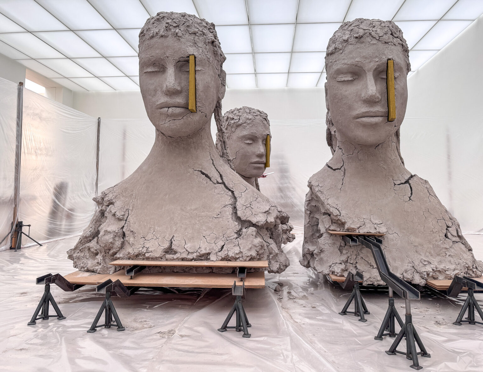 Het werk Composition with four yellow verticals is een immense beeldengroep van vier bustes die op klei lijken. De gezichten van de figuren zijn strak en de ogen gesloten. Goudgele balken komen uit het rechterdeel van het gezicht naar voren dwars door het rechteroog. Manders ziet zijn werk als ‘vastgezette gedachten’ en zo lijken de balken ook te functioneren, als stutwerk. Ik denk opeens aan de moeheid die je soms kunt voelen en dat je ogen denkbeeldig opengehouden moeten worden door ‘luciferstokjes’. Het motief van planken en balken in de gezichten komt vaak voor in het werk van Manders. Ze brengen iets van psychische spanning aan in het hoofd. Indrukwekkend wordt het werk als ik me realiseer dat de klei geen klei is maar geschilderd brons. Ze staan op houten planken die door zwartmetalen balken en poten overeind worden gehouden. Alles lijkt hier tijdelijk en onaf. De ruimte wordt omringd door plasticfolie. In de prachtige interviewreeks Hollandse meesters zien we Manders door zijn atelier lopen waar verschillende compartimenten met beelden te zien zijn, omzoomd door plasticfolie, als kwetsbare tijdelijke wanden. Dat zien we letterlijk terug in de tentoonstelling.
