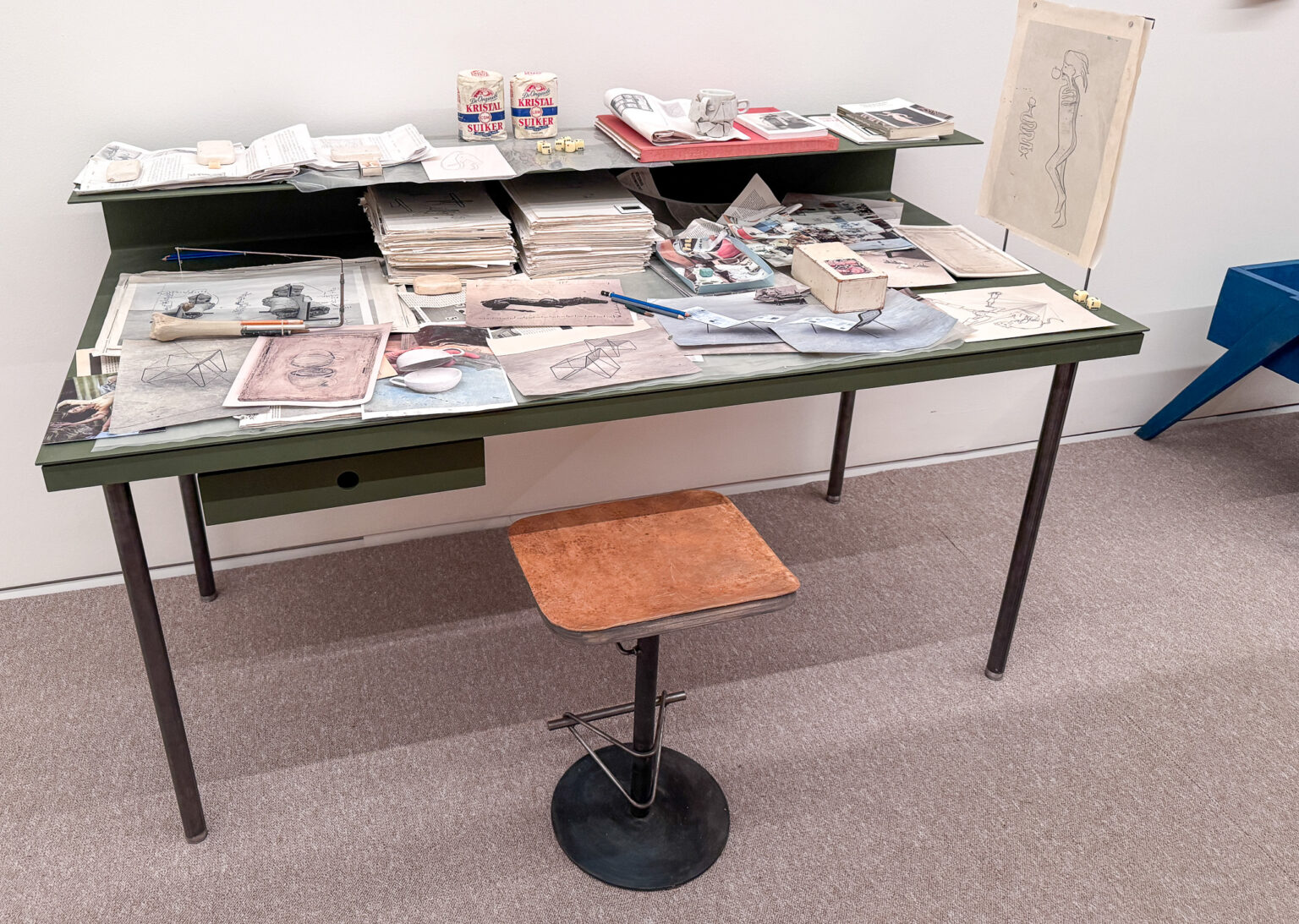 De immense objecten in het museum zijn zorgvuldig opgesteld in verschillende ruimtes die in veel gevallen helemaal worden getransformeerd. Zo zijn er veel ruimtes die worden voorgesteld alsof we in zijn atelier rondlopen. Met veel planken, tafels en kasten, plastic zeil, een grote hoeveelheid schetsen, maquettes, kunstboeken en een heuse werktafel die zo in zijn geheel uit zijn atelier lijkt te zijn gehaald. Twee pakken CSM kristalsuiker staan op de rand. Alleen die staan al voor een hele reeks aan herinneringen en associaties.